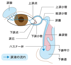 まぶたの上辺りにある「涙腺」で作られた涙は、眼球の表面を潤し、「涙小管」、「涙嚢」、「鼻涙管」を経て鼻内へと流れます。