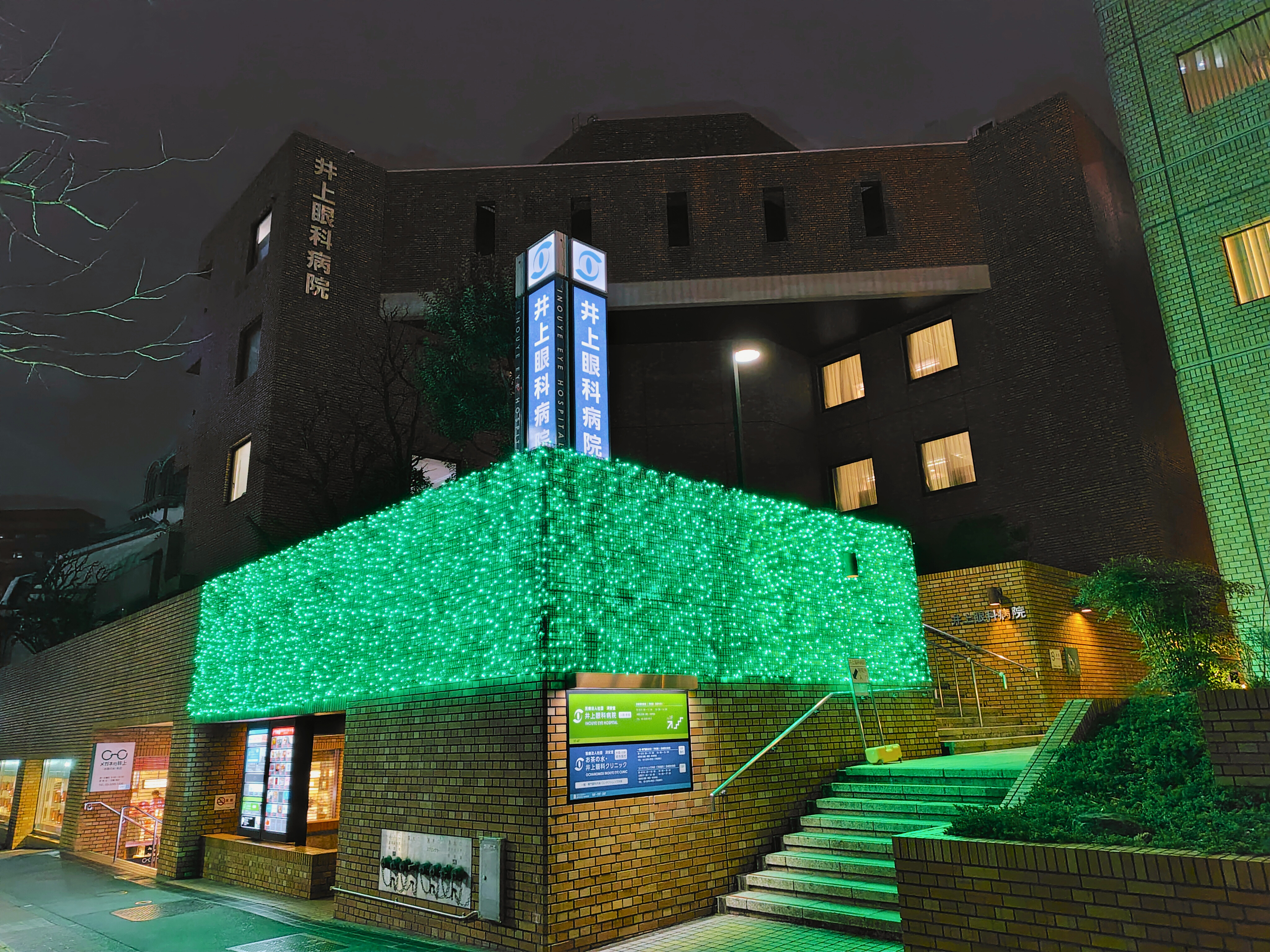 井上眼科病院グループでは世界緑内障週間(2025年3月9日~15日)に合わせて、緑内障の啓発を行う「ライトアップinグリーン運動」に参加しています。世界緑内障週間は2008年から毎年3月上旬の一週間と定められ、世界各地で緑内障啓発活動が行われている国際的イベント。国内では2015年よりスタートし、現在は病院だけでなく、日本各地のランドマークなど1500施設以上がライトアップの活動に参加しています。