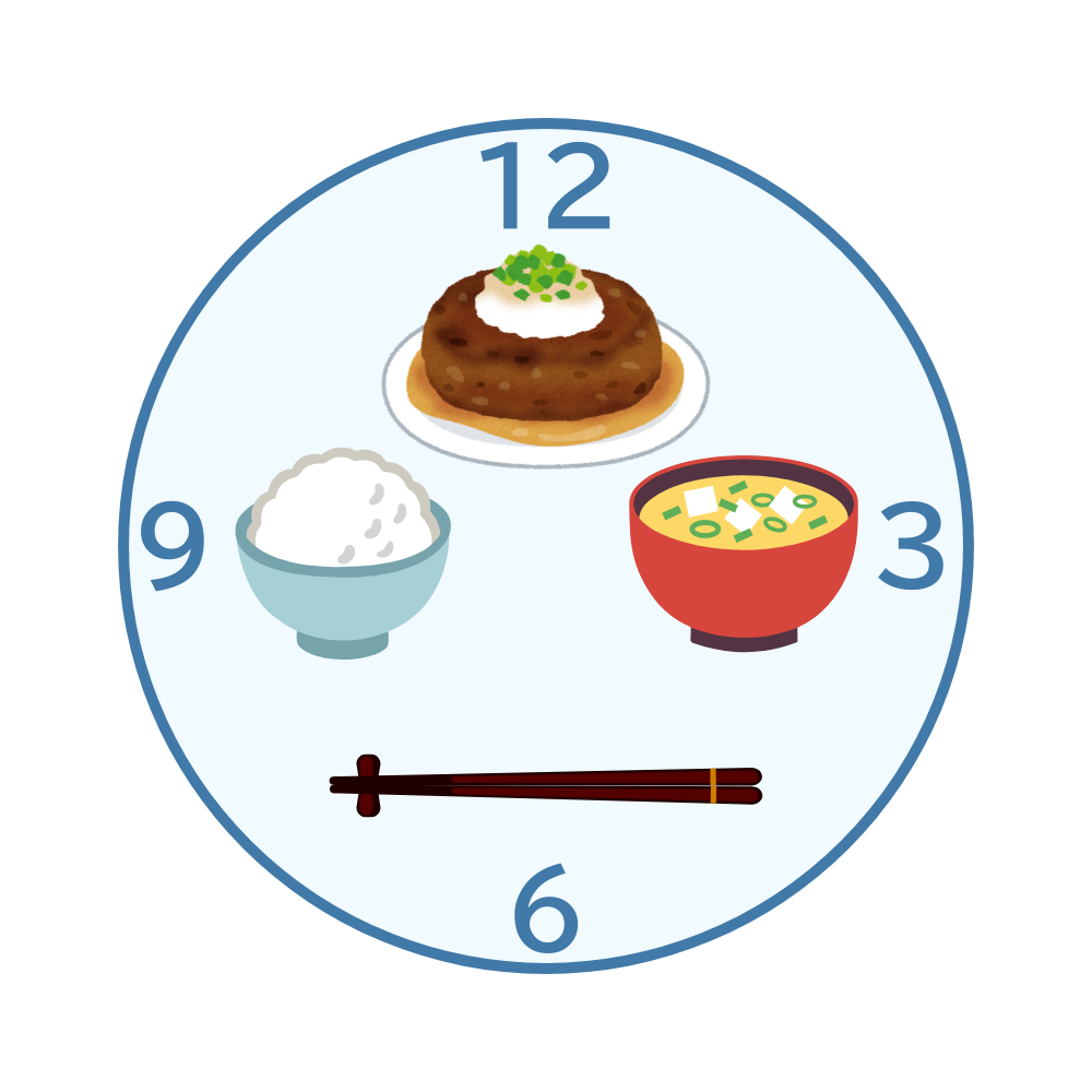 モノの位置などを説明する時についつい「あれ」「これ」と指示語を使ってしまいがち…。そこで役に立つのが「クロックポジション」という考え方。介助を受ける人から見て、正面を12時、右を3時、左を9時とアナログ時計の文字盤に見立てて位置を伝える方法です。食事の際にも活用でき、配膳の位置を『6時(手前)にお箸、12時にハンバーグがあります』などと伝えることができます。また、情報を伝えるときは、大まかな位置や場所を伝え、その後に具体的な説明を加えていくと相手もイメージしやすくなりますよ。ぜひ、活用してみてください。