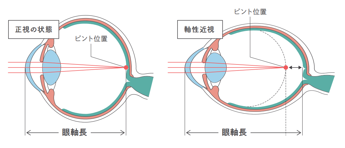 眼球の長さ(眼軸長)が正常よりも長くなることで起こる近視の一種です。眼球が前後に長くなるため、光の焦点が網膜の「手前」で合ってしまい、遠くがぼやけて見える状態になっています。
