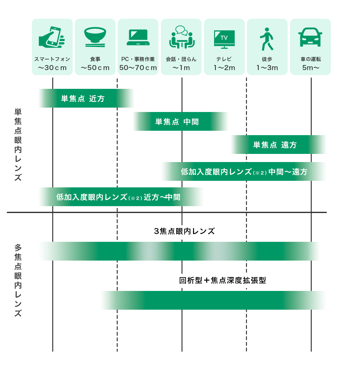 <レンズの種類と焦点距離>手術後の見え方にご満足いただけるよう、たくさんの眼内レンズの中から、患者さまのライフスタイルに適切なレンズをご提案いたします(※1)